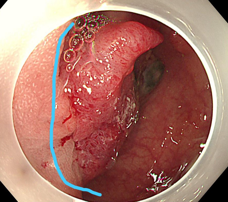 粘膜下に生理食塩水を局注し、ブルーのラインで切除します。