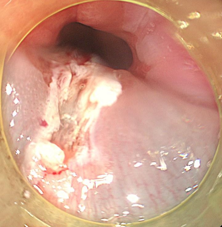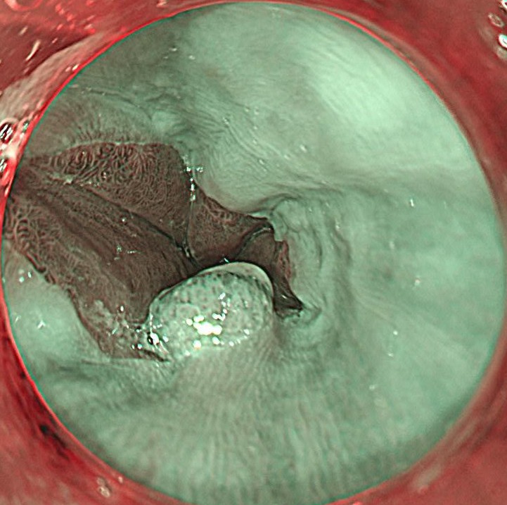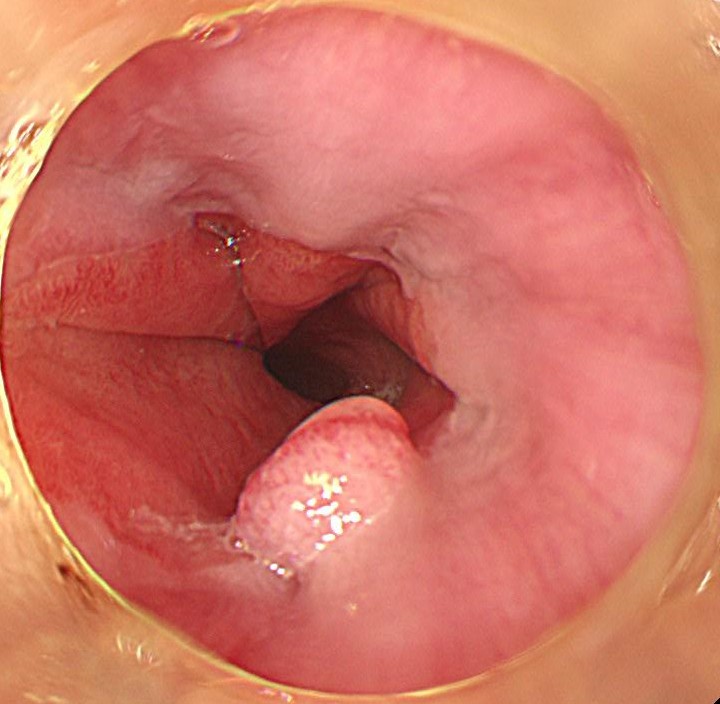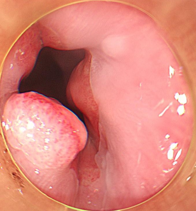 狭帯域光 (NBI) 観察しますと、腫瘍血管は認めず、良性の炎症性ポリープと診断しました。有症状であり、また今後のがん化のリスクも否定できない (エビデンスレベルは低いですが) ため、治療対象と判断しました。