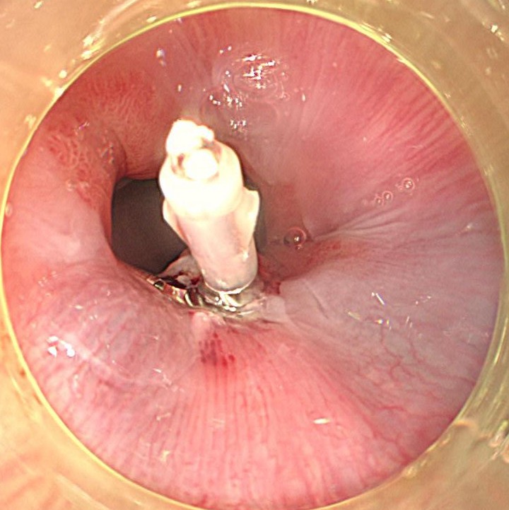 型のごとく、内視鏡切除 (EMR) しました。病理学的には悪性所見はありませんでしたが、高度な炎症細胞浸潤所見を認めました。典型的なバレット食道であり、今後も逆流性食道炎治療を継続しながら、注意深く経過をみていく必要があります。